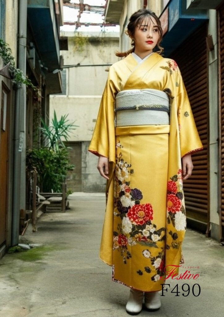 ヴィンテージ黄色振袖|レトロ街並みに映える大人モダン成人式コーデ【熊本】F490