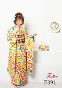 4. レトロモダン黄色振袖|大花柄が映えるポップで個性派な成人式コーデ【熊本】F391