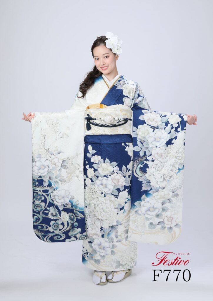 古典青色振袖|白牡丹が映える王道上品な成人式振袖【熊本】F770