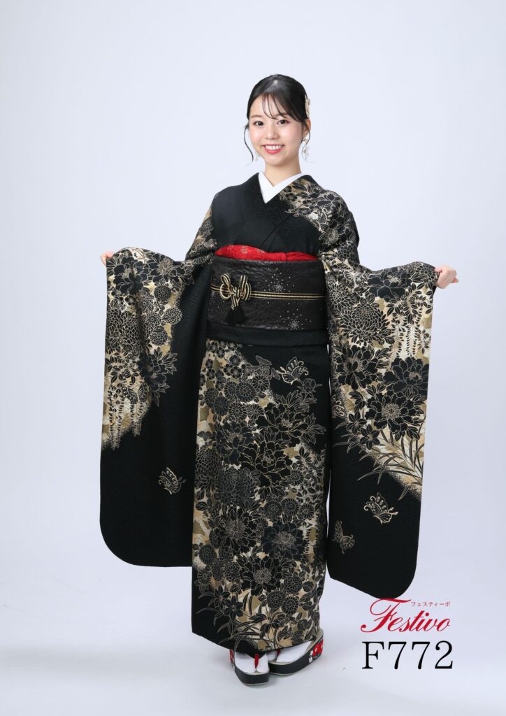古典黒色振袖|金彩花柄が映える格調高い成人式振袖【熊本】F772