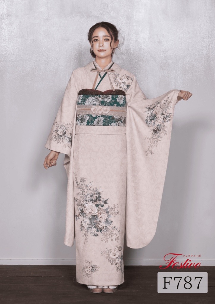 くすみベージュ振袖|淡色花柄が叶える上品ナチュラル成人式コーデ【F787】