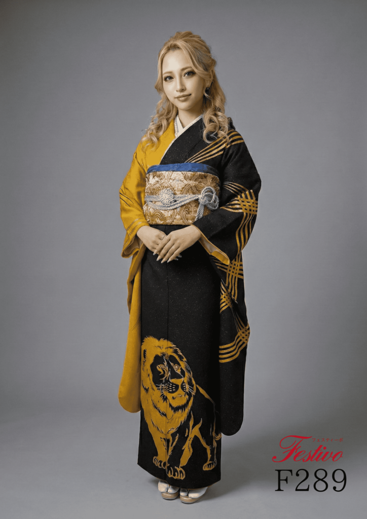 黒×黄の粋ギャル振袖|迫力の獅子柄で魅せる個性派成人式コーデ【熊本】F289
